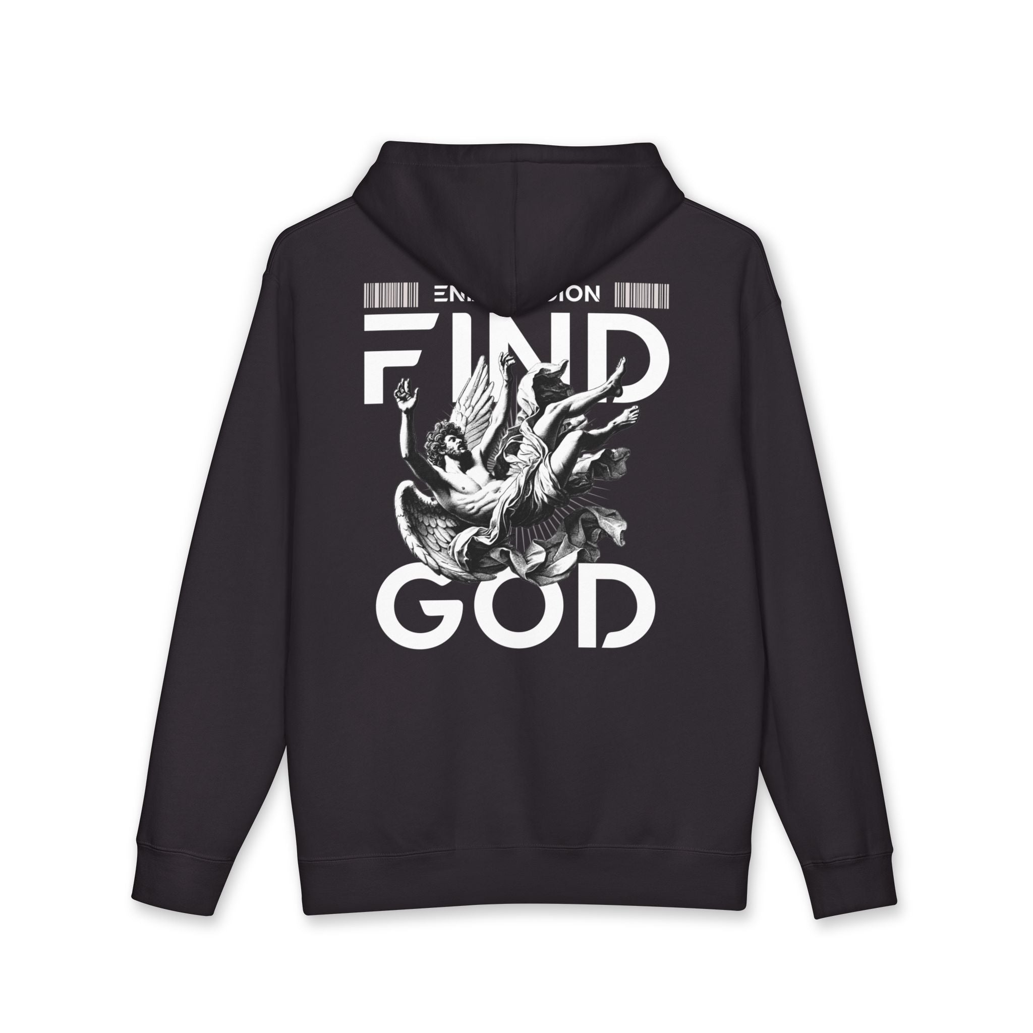 The End Religion Find God Hoodie carries the same message as the tee — stripped of performance, pointed toward the real thing. Classical fallen angel. Barcode. Two commands that cut through every layer of churchianity and get to the only thing that ever actually mattered.