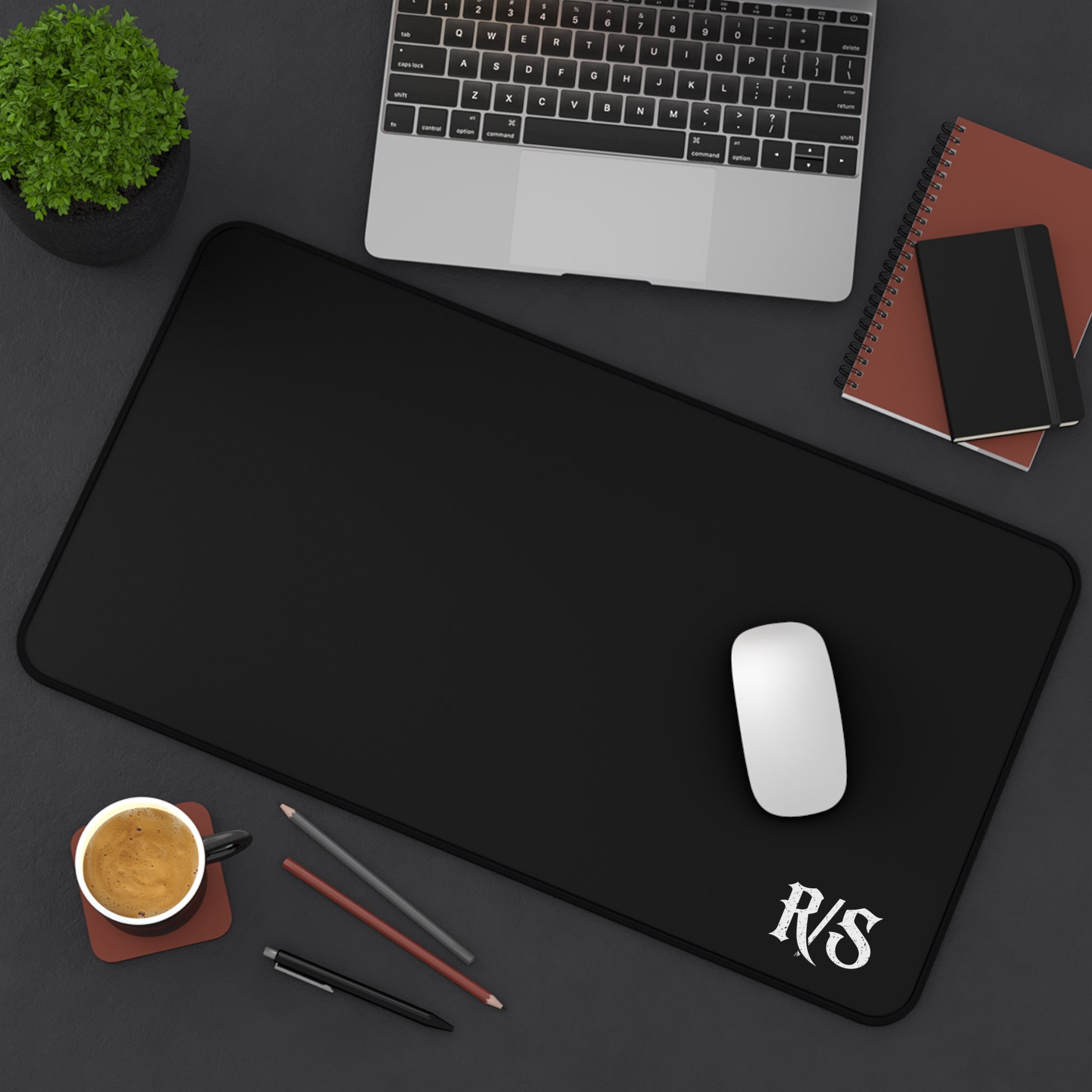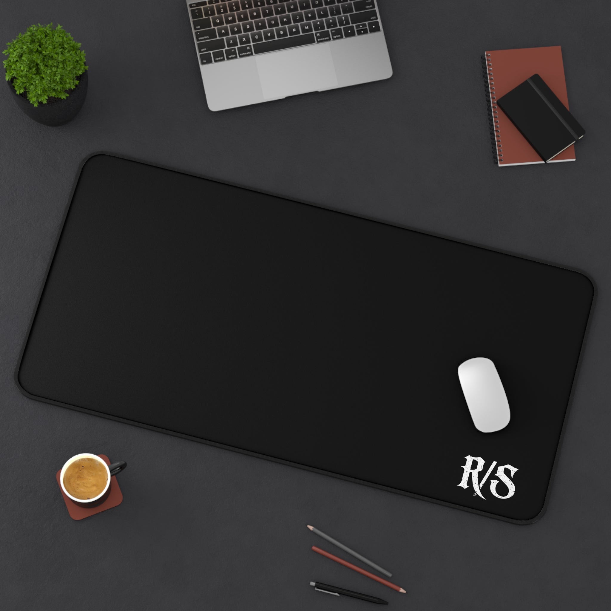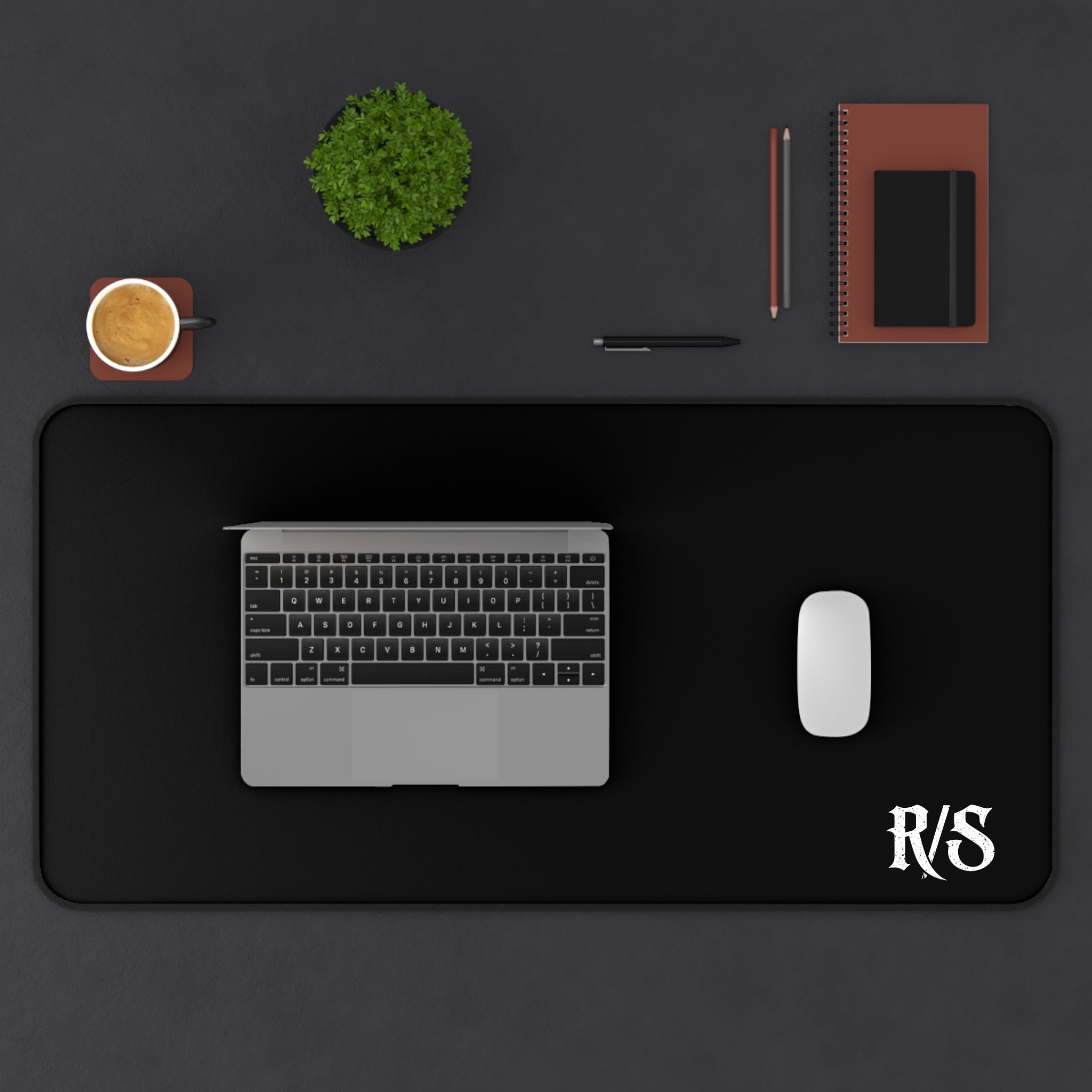 The R/S monogram in the corner. Nothing else. The desk mat for the man who doesn't need reminders plastered everywhere — just the mark that means everything, right where the work happens.